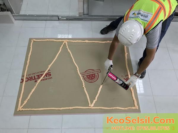 - Bơm đều keo lên bề mặt cần dán, cách mép ngoài cỡ 2cm. Tiếp tục dán tương tự lên hết các bề mặt cho đến hết.